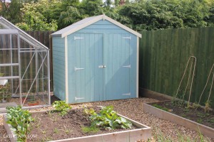 diy painting and installing small shed – duck egg blue beach hut in garden-27