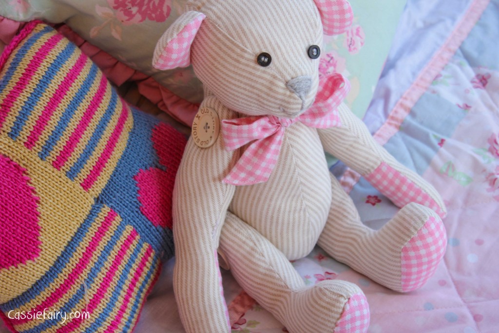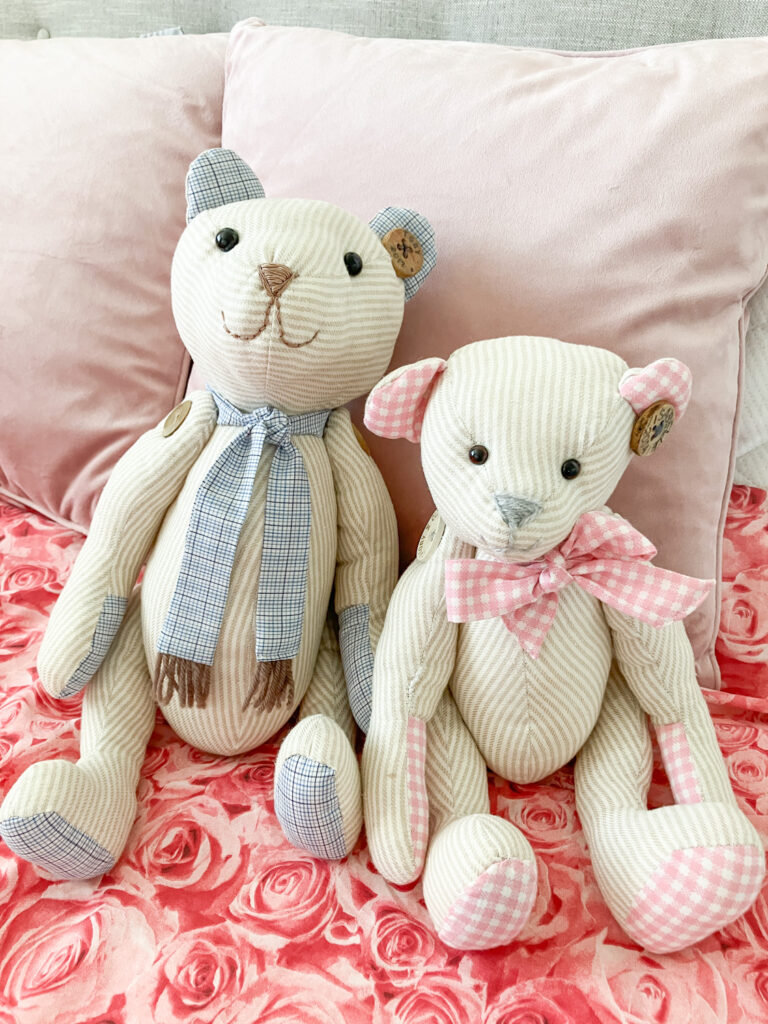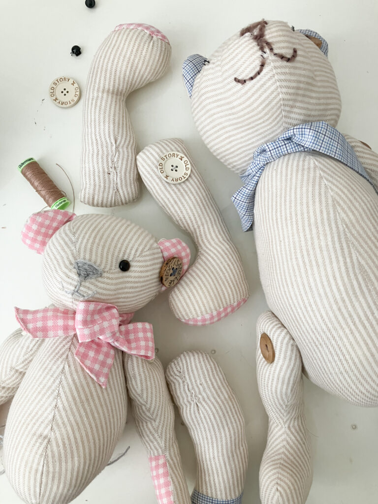 For my next two bears, I used the Bear Making for Beginners Charlie Bear pattern. As the pattern pieces for bears are only small, I was able to upcycle the baby clothing of my other niece and nephew to create memory bears for them.