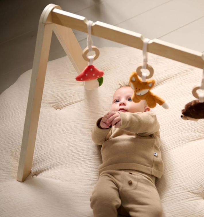Playmats and play gyms are also handy for tummy time at this age and are often full of colour and pattern that attract the baby and keep them engaged. Plus, teething toys with different textures are very handy to help soothe little ones during this phase.