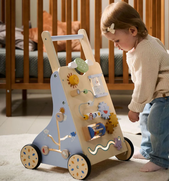 They’ll start to take their first steps during this time, so you can support this activity with a baby walker. If you choose one with interactive details like cogs and an abacus, it’ll double up as an engaging activity centre that improves their motor skills, too.