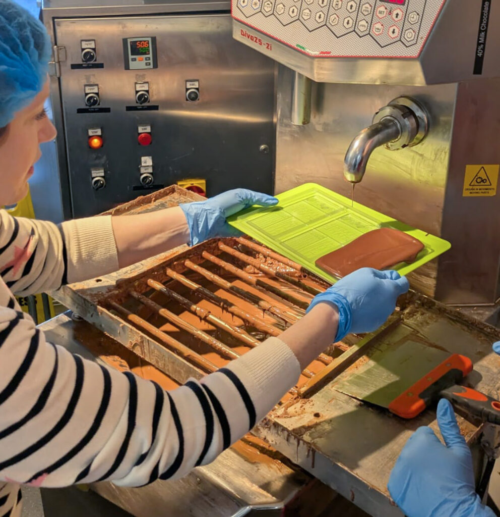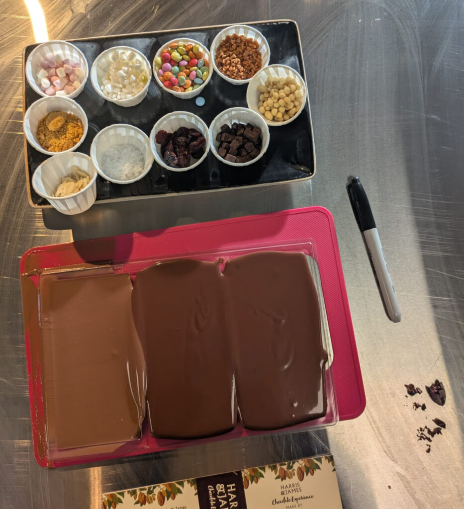 It was a magical moment when we were allowed to control the pedal to pour molten chocolate into our moulds. Even choosing the toppings from the wall packed with jars of goodies was a highlight! I made a dark chocolate bar with cranberries and meringue and then went super sweet with milk chocolate sprinkled with crispy caramel shards, sea salt flakes and crushed gingerbread.