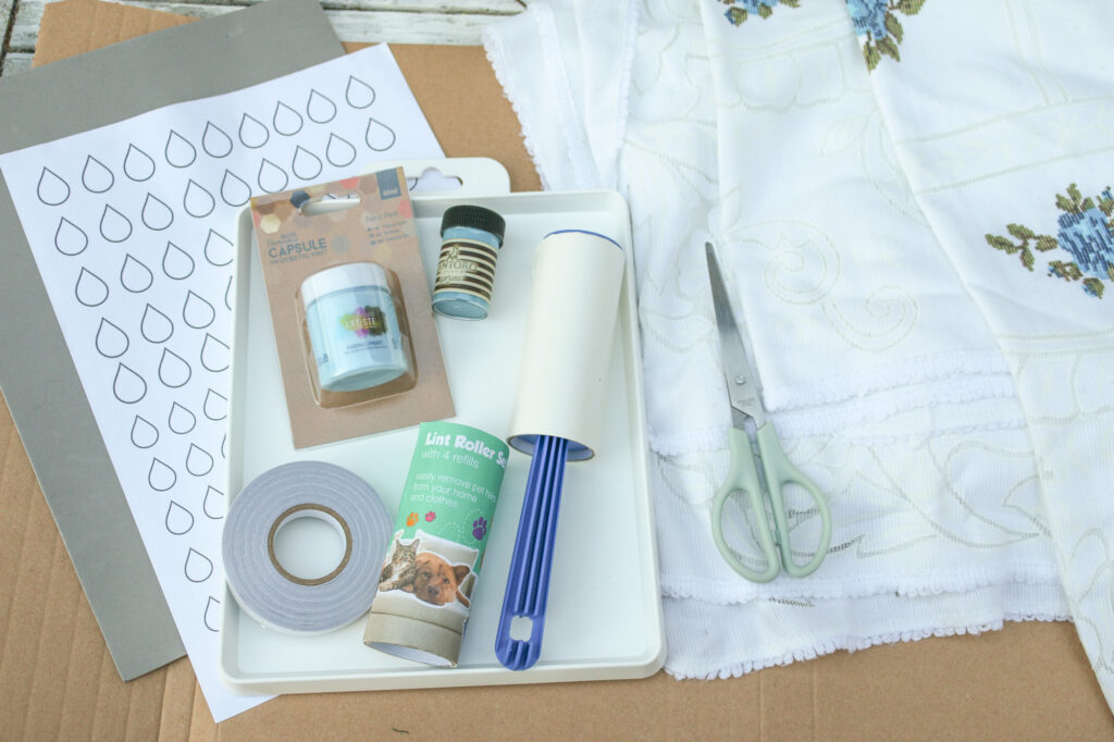 Fill an ink tray (or even a baking tray, or a paper plate) with fabric paint and spread it out over the surface. Carefully roll the lint roller into the fabric paint so that the raindrops pick up an even coat of paint.