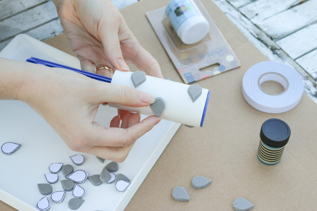 The handy thing about a lint roller is that it already has a sticky surface, which is ideal for sticking the foam shapes to. So, peel off the protective top sheet of paper on the lint roller to reveal the sticky surface and space out the foam raindrops. Press them firmly onto the lint roller to stick in place.
