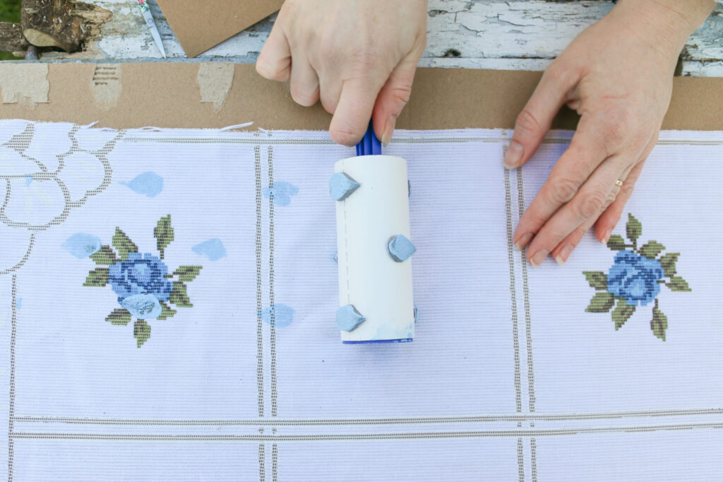 Place the fabric onto a piece of cardboard with the right side up. Use the lint roller to print the raindrops onto the fabric. When the print becomes patchy, re-roll in more fabric paint and continue.