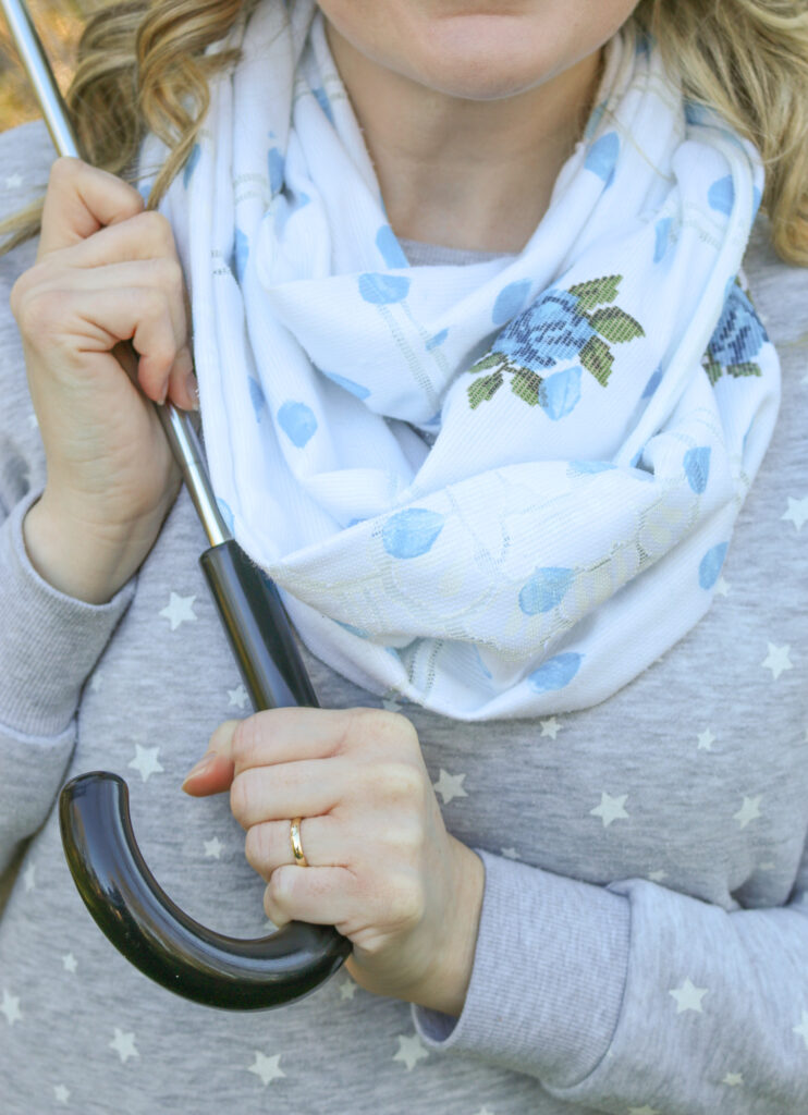You can use any cotton or linen fabric, such as an upcycled tablecloth, to make this project. This creates a scarf that’s light enough for bright spring days but will keep you warm enough when there’s a nip in the air.